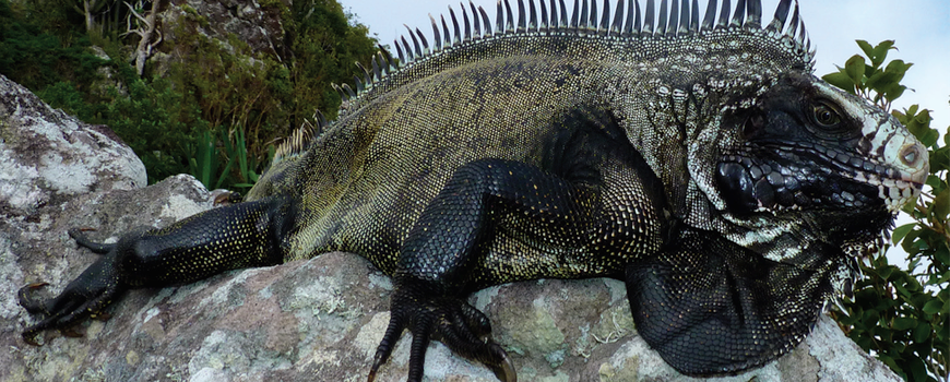 Iguanas are unique reptiles that can be found throughout the Caribbean and surrounding areas of Central and South America. Previously, three species of iguanas were known to inhabit the Lesser Antilles. These included the Lesser Antillean iguana (Iguana delicatissima, found in only very few islands including St. Eustatius), the common iguana (Iguana iguana iguana, introduced from South America represented also by the two newly described endemic subspecies I. iguana sanctaluciae from Saint Lucia and I. iguana insularis from Saint Vincent and the Grenadines, and Grenada) and the introduced Iguana rhinolopha from Central America. New research points to a fourth species, the painted black iguana (Iguana melanoderma) found on the islands of Saba and Montserrat, along with St. Croix, St. Thomas (US Virgin Islands) and the islands of Margarita, Los Roques and La Banquilla (Venezuela) (Lazell, 1973; van Buurt, 2005). Using physical characteristics and genetic testing, Dr. Michel Breuil and his colleagues are working to fully describe this new species and hope to encourage conservation efforts to protect this unique iguana. This was recently published in ZooKeys journal.