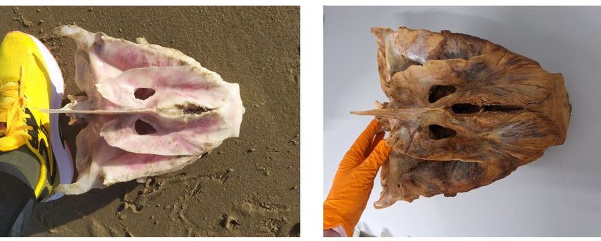 In mid-November, Danny Marees spotted a peculiar bone on the beach while running. Rather flat, with a few large holes, and judging by the pink color still very fresh. He could not take the bone with him, but he took beautiful pictures of it and sent them to the question service of Naturalis the same day. Danny wrote: "For imaging purposes, shoe size 43 is next to it." That's roughly equivalent to 28 centimetres. After research in Naturalis' fish collection, it became clear that the bone is a piece of tuna skull. It is the upper part: the neurocranium. We suspect from a bluefin tuna. In the 1960s this impressive fish had disappeared from the North Sea, probably due to overfishing, but since 2017 it has been seen again occasionally. On September 24th of this year, one of 240 centimetres had washed ashore near Ritthem (Vlissingen municipality). That one is included in our scientific collection. On November 18th, a 190 centimetre specimen was found on the beach at Zoutelande, but unfortunately it has not been preserved. This loose skull part from Den Helder beach may be more likely to be a remnant from fish processing. Interestingly, another tuna neurocranium was found a week later on Texel, by Ank Hobo. About the same size, but it appears to be different in details from Danny's specimen.