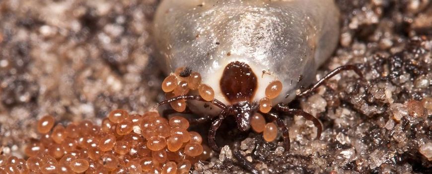 Om de eitjes te beschermen, besmeurt het tekenvrouwtje de eitjes met een glazige vloeistof (op de afbeelding te zien). Nadat alle eitjes zijn gelegd, sterft het vrouwtje. Doordat alle eitjes op een hoopje zijn gelegd, kunnen in het volgende voorjaar honderden tekenlarven tegelijk op een klein plekje tevoorschijn komen. Deze minuscule larven hebben nog geen bloedmaaltijd gehad en vormen daarmee gelukkig geen risico voor de ziekte van Lyme bij mensen. Maar ze kunnen zich wel vastbijten.