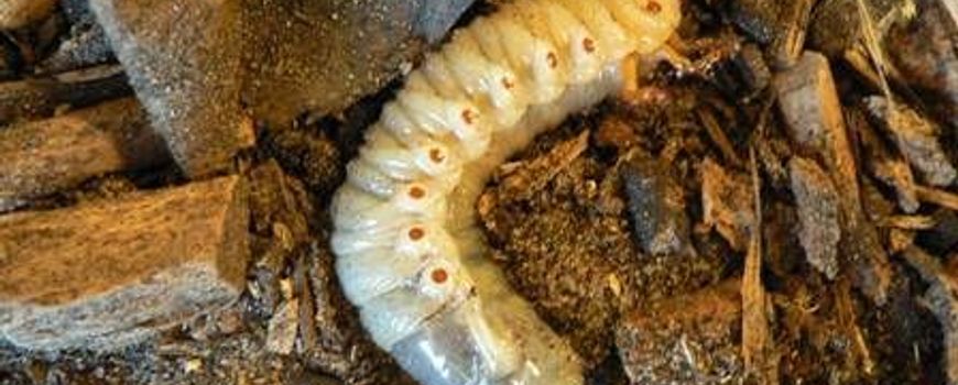 | Een engerling van de neushoornkever tussen de houtsnippers |