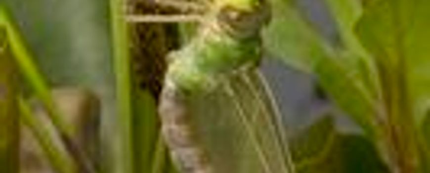 In de begroeiing langs wat grotere wateren kunnen we nu uitsluipende keizerlibellen aantreffen. De larve kruipt uit het water, barst open en de libel kruipt er uit.