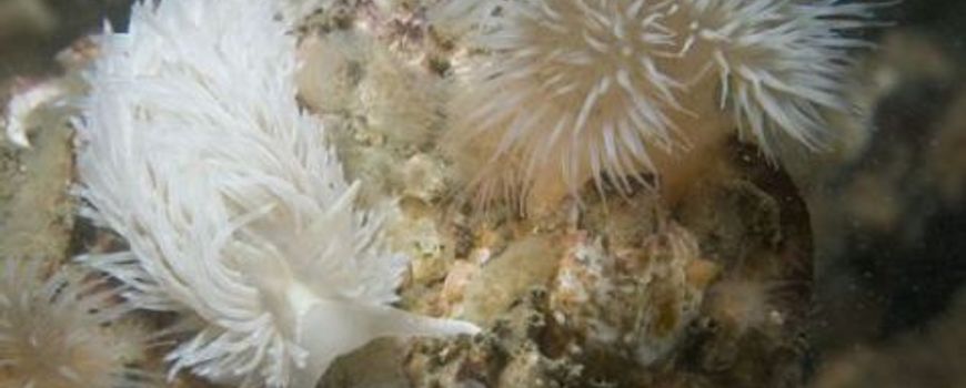De planktonische larven van de Grote vlokslak, Aeolidea papillosa (zie foto hieronder), reageren in het najaar waarschijnlijk direct op de afkoeling van het zeewater. Rond oktober zien we overal op de kust kleine spierwitte zeenaaktslakjes verschijnen. Het zijn de jonge Grote vlokslakken die vlak daarvoor de metamorfose van larfje naar juveniel zeenaaktslakje hebben doorgemaakt. Zij voeden zich met zeeanjelieren en -anemonen, organismen die hier het hele jaar door aanwezig zijn. Gedurende de wintermaanden groeien ze gestaag om in de late winter een lengte van maximaal 12cm te bereiken. Dan begint de paring en de rest van het verhaal kent u al: eisnoeren worden afgezet, de uitgeputte volwassen dieren sterven, uit de eitjes komen larfjes en het duurt weer tot oktober voor we de eerste juveniele Grote vlokslakken terugzien.