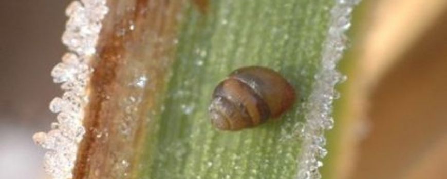 Zeggekorfslak tussen de ijskristallen. Voor de winter zetten de dieren zich vast op een zeggeblad. De mond van het slakkenhuisje wordt daarbij afgesloten met een verhard slijmvliesje. Zo voorkomen de dieren dat ze uitdrogen.