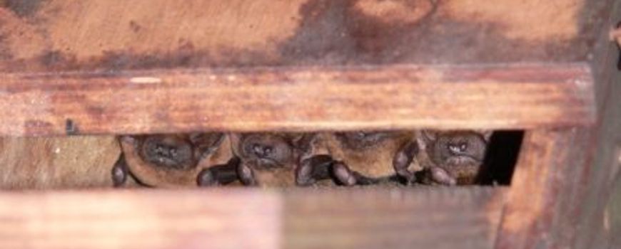 Foto: Erik Korsten, Rosse vleermuizen (boven) in een vleermuiskast. En grootoorvleermuizen in een vleermuiskast (onder).