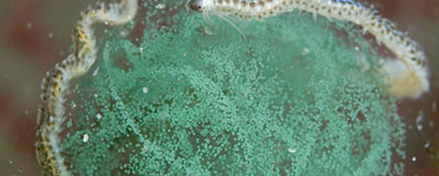 Op dit moment zien sportduikers onderwater in onder andere de Oosterschelde, Grevelingen en Veersemeer per duik duizenden sprankelend groene eiklusters van de gestippelde dieseltreinwormen.