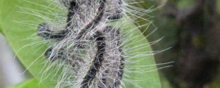Foto 2: Eikenprocessierupsen, op het zwarte gedeelte van de huid verschijnen later de brandharen (Foto: Silvia Hellingman).