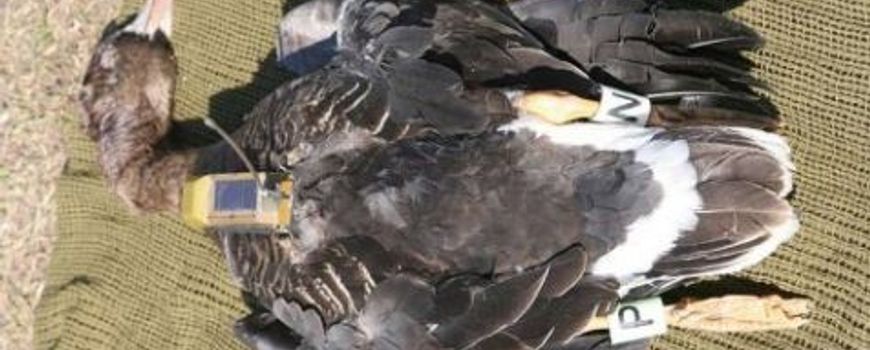 Marco was als een van de laatsten op weg naar zijn broedgebied, en deed dit op zijn eigen tempo. Boven het plaatsje Ryazan kwam zijn lange vlucht echter tot een dramatisch einde: een plaatselijke jager schoot het dier uit de lucht. Dit gebeurde op 26 april jongstleden. De jager heeft, dankzij de op de zender vermelde gegevens (foto rechtsonder), inmiddels contact opgenomen met de coördinator van het kolganzen-project, Helmut Kruckenberg. De jager verklaarde dat Marco helemaal in z’n eentje voorbij vloog en dat de zender van onderaf niet te zien was.