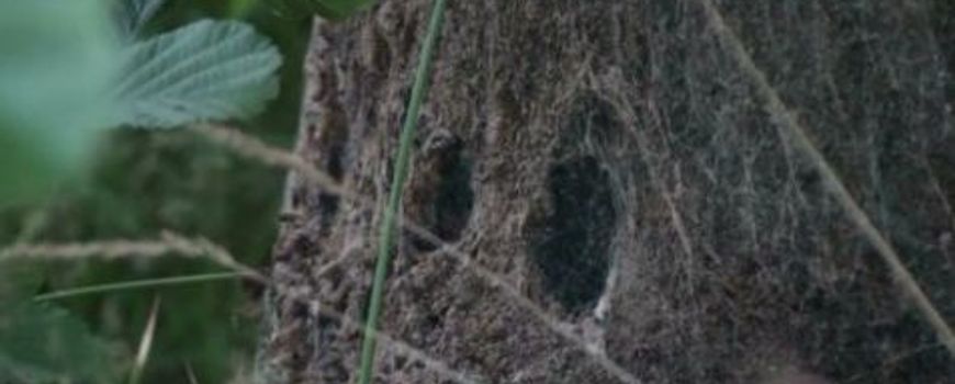 Foto: Nest eikenprocessierups aan de voet van de stam van een zomereik. In het nest bevinden zich duizenden eikenprocessierupsen. Foto: Arnold van Vliet.