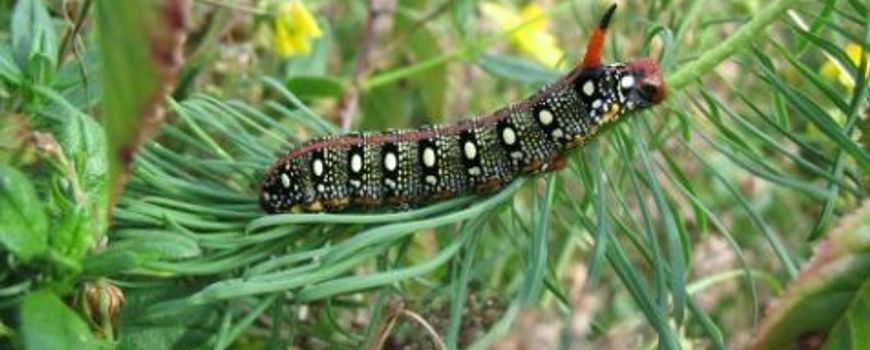 Een vrijwilliger van Natuurmonumenten heeft eind juli zeven rupsen van de wolfsmelkpijlstaartvlinder gevonden in de Kwade Hoek. De rupsen zaten op de plant, hoe kan het ook anders, zeewolfsmelk.