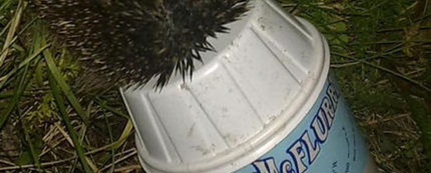 Ondanks maatregelen kunnen egels nog steeds vast komen te zitten in een weggegooid Mc Flurry bekertje. De Zoogdiervereniging ontving foto's van een verstrikte en later bevrijde jonge egel.