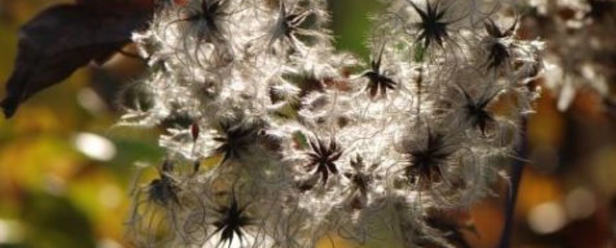 Veel planten herken je in eerste instantie aan hun bloemen, maar in deze tijd van het jaar moeten we terugvallen op andere kenmerken. Bosrank (Clematis vitalba) is een klimplant en ons assortiment aan klimplanten in het wild is overzichtelijk, zeker aan soorten van dergelijke omvang. We kunnen de liaan daarom ook in deze tijd van het jaar gemakkelijk herkennen. De slangachtige stammen kunnen tot tientallen meters lang en polsdik worden. Kenmerkend zijn ook de vruchten met hun baardachtige structuur. Vooral mooi als het licht van de laagstaande najaarszon er doorheen schijnt. De Engelsen, goed in poëtische plantennamen, noemen hem niet voor niets Old Man’s Beard; al is Traveller’s Joy - ook niet slecht - de officiële naam.