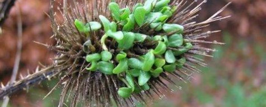 De zaden van Grote kaardenbol zijn smakelijk voedsel voor vogels. Als je geluk hebt, ontdek je een kneu, groenling of putter, die halsbrekende toeren uithaalt om de zaden te bemachtigen. Blijven de zaden langer zitten, dan blijkt zich een bijzonder fenomeen voor te kunnen doen, zoals blijkt uit de foto. De zaden van de kaardenbol zijn in de bol ontkiemd, mogelijk door het warme en vochtige weer eind november. Inmiddels zal het winterweer waarschijnlijk wel een eind hebben gemaakt aan deze vroegtijdige opleving.