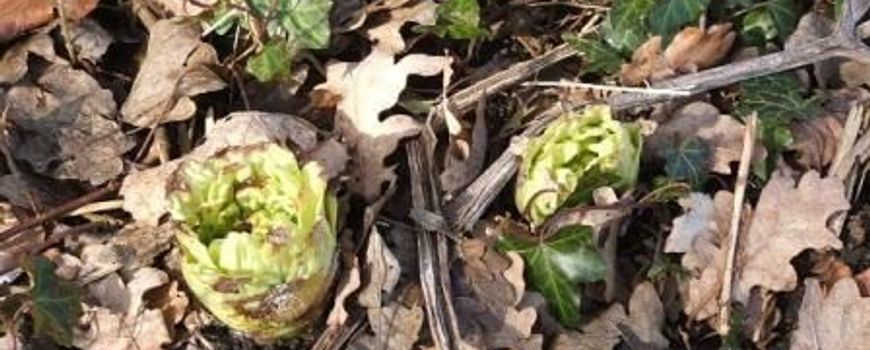 In oude stads- en dorpsparken op vochtige kleiige en venige bodems, onder bomen, ontwikkelen zich in deze tijd de markante bloemen van het Japans hoefblad (Petasites japonicus). Het is een uit het verre oosten ingevoerde nauwe verwant van het bekende Groot hoefblad (P. hybridus). Bij beide soorten verschijnen de bloeiwijzen vóórdat de bladeren zich ontwikkelen. Evenwel zijn de bloeistengels niet roze zoals bij het Groot hoefblad, maar bleekgroen. De schubbladen onder en in de bloeiwijzen zijn opvallend groot en eveneens bleekgroen. De bloemen zijn vuilwit.