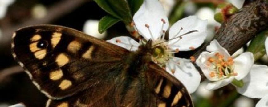 Zeker zolang er nog niet veel andere planten bloeien is sleedoorn een gewilde plant voor voorjaarsvlinders. Sleedoorn staat veel in hagen en bosranden in het buitengebied, maar is ook vaak aanwezig in stad en dorp, in aangeplant bosplantsoen. Voordat de bladeren uitlopen komen de witte bloemen tevoorschijn. Nu en de komende dagen zien we overal die prachtig witte struiken. Het is zeker de moeite waard om daar op zoek te gaan naar vlinders. Zoek daarvoor struiken die lekker zonnig staan, maar die niet de volle wind vangen. Je kunt op sleedoorn vrijwel alle vlinders die nu actief zijn tegenkomen. Zelfs het bont zandoogje (foto rechts), dat niet vaak op nectarplanten te vinden is, kun je er van zien drinken. Klein koolwitje en klein geaderd witje zijn er beide op te vinden, maar ook dagpauwoog, kleine vos en gehakkelde aurelia zijn er gek op. Met deze warme en zonnige dagen gaat de bloei van sleedoorn erg snel. Veel sleedoorns staan nu op het punt van in bloei komen of bloeien al. Met een beetje aanhoudend mooi weer zijn ze over een week al wel ongeveer uitgebloeid. Voor de vlinders is dat geen probleem, want dan komen ook allerlei andere bloemen in bloei waar ze hun nectar uit kunnen halen.