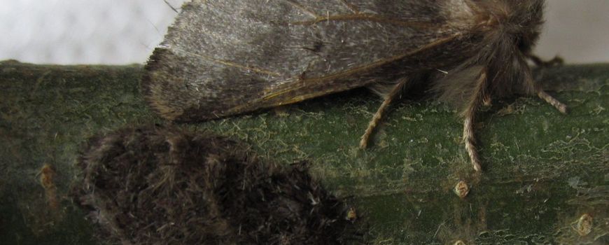 Zodra de vlinders uit hun poppen kruipen moeten ze eerst hun vleugels oppompen. Daarna kunnen ze op zoek gaan naar een partner om te paren (zie foto hieronder) en eitjes af te zetten. Silvia Hellingman heeft de afgelopen week het eiafzetgedrag van de vrouwtjes nauwkeurig bestudeerd. Eerst kromt het vrouwtje haar achterlijf en zet eitjes af. Daarna schuift ze haar achterlijf over de eitjes heen en blijven de haartjes aan de eitjes plakken. Daarna schuift ze nog verder naar achteren en met haar achterpootjes schikt ze de haartjes verder. In dat proces wordt het achterlijf steeds kleiner. Aan het eind van de eiafzet gaat ze met de achterpootjes over het duidelijk ingekorte lijf om de laatste haartjes over de eipakketjes heen te plakken. De eitjes worden zo goed gecamoufleerd (zie onderste foto). Na bestudering van de haren die op het eipakket geplakt zijn onder de microscoop blijkt dat er ook brandharen tussen zitten.
