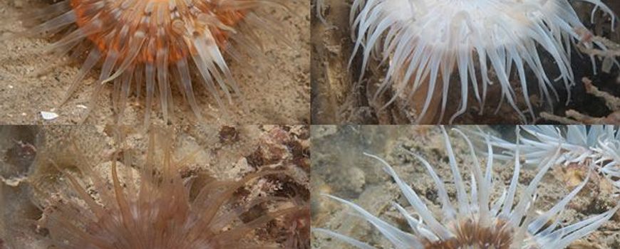 Op de Europese kust zijn vijf kleurvariëteiten van de Sierlijke slibanemoon bekend. Var. miniata (links boven) heeft een bruinwitte gemarmerd kleurpatroon en is zowel in Zeeland als elders op de Europese kust het meest algemeen aanwezig. Var. nivea (rechts boven) is egaal wit en var. rosea (links onder) is witroze tot egaal bruinrood gekleurd. Beide zijn duidelijk minder algemeen aanwezig maar worden de afgelopen jaren steeds vaker aangetroffen in de Oosterschelde. Var. venusta (links onder) is hier de meest zeldzame maar ook de mooiste van het stel: de centrale mondschijf is oranje en de tentakels zijn wit met een bruine basis. Hij is beken