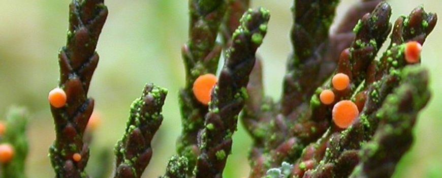 Na weken sneeuw krijg je de kriebels om er op uit te gaan en paddenstoelen te gaan zoeken. Altijd op zoek naar iets speciaals en de eerste vondst van het jaar. Eigenlijk is het een soort eerste kievietsei gevoel. Van verschillende paddenstoelen is bekend dat ze tevoorschijn komen op het moment dat de sneeuw, die ze bedekt, smelt. En sneeuw hebben we de afgelopen tijd genoeg gehad. Op het terrein van een nauwelijks bewerkte boomkwekerij vond Stip Helleman op dode jeneverbesnaalden een oranje schijfje van maximaal anderhalve millimeter doorsnede: het Jeneverbesbekertje (Pithya cupressina). Dit is een echte winterpaddenstoel die nauw verwant is aan de veel grotere Rode kelkzwam die ook zijn voorkomen in de winter heeft.