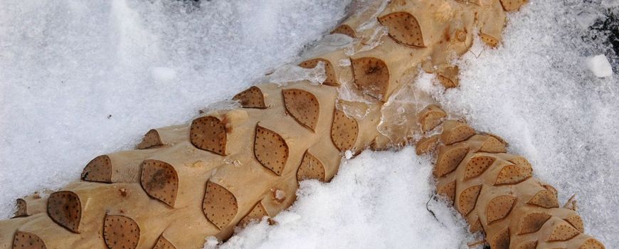 De schaatsfilm schetste een sfeerbeeld waarin ook de natuurbeleving van het schaatsen een duidelijke plek kreeg. Het ‘gaan waar nog geen sporen zijn’. Schaatssporen wel te verstaan, want diersporen zijn daar juist wel. Vooral als er een dun laagje sneeuw ligt. Plantensporen zijn er minder, maar toch kom je op de schaats soms wonderlijke plantaardigheden tegen. Ook hier slechts een ‘spoor’ van het geheel. De groengele dikke ‘stronk’ op onderstaande foto is zoiets. Een gevaarlijk obstakel, met mooie structuur, maar wat is het eigenlijk?