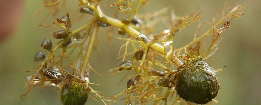 Toch speelt dat alles zich – ongezien – ook min of meer onder onze eigen ogen af. Want in Nederland kennen we verschillende soorten blaasjeskruiden. Het zeldzame Plat blaasjeskruid (Utricularia intermedia) is vrijwel beperkt tot de laagveengebieden van Noordwest-Overijssel, maar de algemeenste, Groot blaasjeskruid (Utricularia vulgaris), kun je ook in sloten en plassen in laagveen- en kleigebieden aantreffen. De vangblaasjes bevinden zich onder water aan de stengels van de plant. Het zijn zakjes waar de plant het water ‘uitpompt’, zodat er een soort vacuüm ontstaat. Zodra een prooi voorbij komt en een haartje op het blaasje raakt, springt de klep open en wordt de prooi razendsnel naar binnen gezogen. Een snack met een snelle trek.