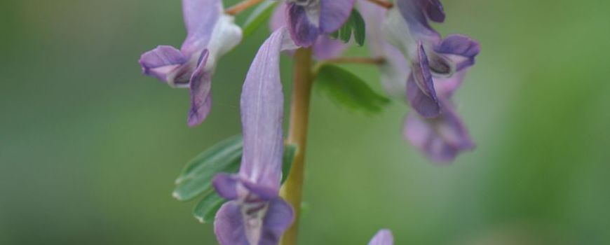 Een van de soorten die veel in stinzenmilieus voorkomt, maar ook daarbuiten regelmatig is aan te treffen is Vingerhelmbloem (Corydalis solida). Deze soort behoort tot de klaproosfamilie, al zie je dat aan de bloembouw niet af. De roodpaarse bloemen zitten in trossen bijeen. Heel af en toe tref je ook een witte vorm, net als bij de verwante - maar zeldzamer - Holwortel (Corydalis cava). Holwortel onderscheidt zich van Vingerhelmbloem door de meestal holle wortelknol, maar gelukkig kun je beide soorten ook uit elkaar houden aan de hand van de vorm van het schutblad (aan de voet van elk bloemsteel). Deze zijn bij Holwortel gaafrandig en bij Vingerhelmbloem handvormig ingesneden. Hándig dus zo’n kenmerk, net als die Nederlandse naam.