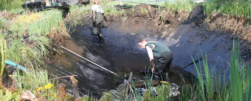 Rond de tuinvijver is al in maart een raster geplaatst met vangemmers om te voorkomen dat de brulkikkers uit de vijver zouden vertrekken of er naar toe zouden trekken. Vorige week is de vijver drooggepompt door medewerkers van RAVON en de tuineigenaar. De dikke sliblaag op de bodem is deels weggepompt en deels handmatig met emmers en kruiwagens verwijderd. Dit bleek nog een flinke klus, maar uiteindelijk is het na drie dagen werk gelukt de vijver geheel droog te leggen. In totaal werden er ruim 3000 kikkervissen van de brulkikker, twee onvolwassen dieren en twee volwassen brulkikkers weggevangen. Daarnaast werden er tientallen vissen, enkele bruine en groene kikkers, een gewone pad en een Alpenwatersalamander weggevangen. Vlak bij de vijver werd ook een kleine watersalamander waargenomen.