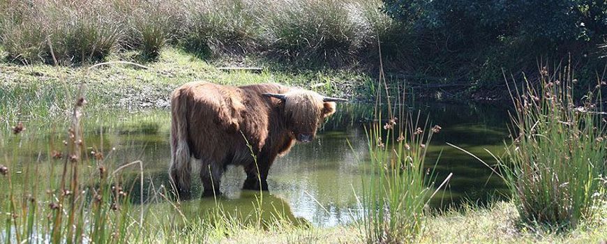 De Schotse Hooglanders en Galloways hadden het misschien wel het zwaarst in dit warme weer. Deze rassen zijn afkomstig uit het Schotse klimaat waar de zomers over het algemeen een stuk milder zijn. Hun dikke vacht is vooral aangepast aan de strenge winters daar. Het warme weer zorgt ervoor dat de dieren hun activiteiten aanpassen. Grazen vindt nu vooral aan het begin en aan het einde van de dag plaats. De rest van de dag brengen ze door in de schaduw of staan ze tot hun middel in het water.