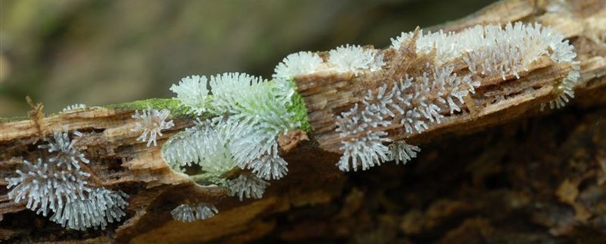 Het IJsvingertje (Ceratiomyxa fruticulosa) is dankzij de vele regen en het koele weer, op dit moment op rottende takken en stammen van loof - en naaldbomen te vinden. Daarbij gaat het soms om plekken tot tien centimeter of meer in lengte. De hoogte van een individueel IJsvingertje is echter nauwelijks meer dan een millimeter. Vanaf het pad of van een afstand gezien lijkt het IJsvingertje een grauwwitte plek op het hout. Niets om bij stil te staan. Er is een loepje voor nodig om de “vingertjes” goed te zien. Met een beetje geluk vind je ze nog in het kruipend stadium van uitstulpen en vochtig slijm afscheidend.