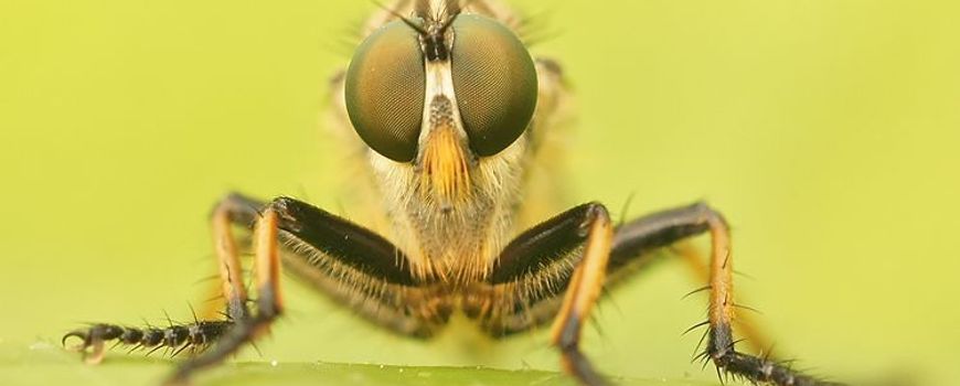 Twee van de 410 soorten: Bosrandroofvlieg Neoitamus cyanurus en Tenthredo livida (Foto’s: Henk Wallays)