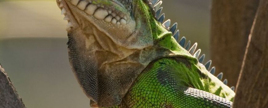 The Lesser Antillean Iguana and the Green Iguana can be most easily distinguished by the large subtympanic scale that can be found under the jaw on the cheeks and the unmistakable black and green banding of the tail, both typical features of the Green Iguana.