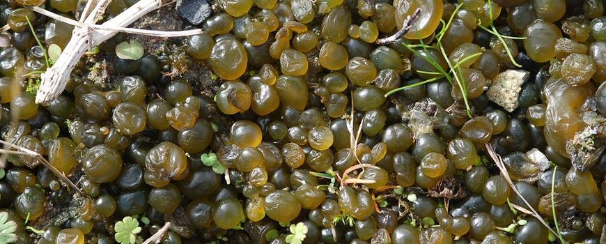 Blauwalgen hebben een kwalijke reputatie als het over zwemwater gaat. Bepaalde blauwalgen scheiden giftige stoffen die ziektes kunnen veroorzaken. Nostoc pruniforme is echter een onschuldige soort. Ze leeft al 50 miljoen jaar onder dezelfde vorm op onze aarde en is dus eigenlijk een levend fossiel. In Engeland houdt de soort er een fraaie volksnaam op na: Mare’s eggs (of moeraseieren). Goed gevonden, eigenlijk, want deze eitjesachtig uitziende bolletjes groeien vooral op vochtige rotsbodems en op de bodems van meren en bronnen (met zoet of zout water). Na lange periodes van aanhoudende neerslag, kunnen deze mini-eitjes plots massaal verschijnen maar ze kunnen evengoed droogtes van meer dan 70 jaar overleven. De grootte kan sterk variëren maar ze kunnen tot 1 cm worden, net groenige knikkers.
