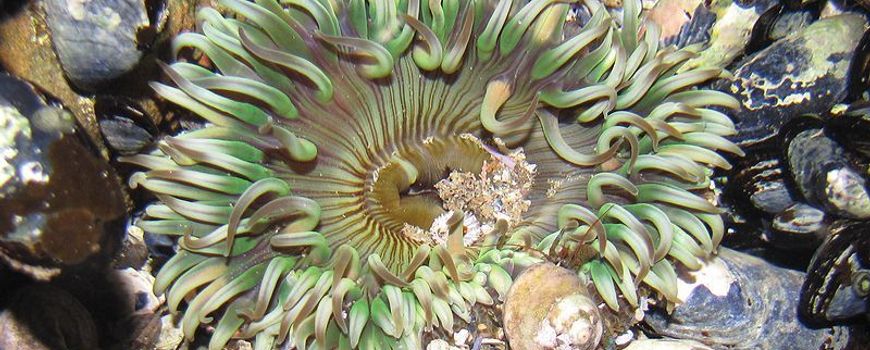 “We waren verrast, want waarom beschikt een zeeanemoon (foto: Anthopleura elegantissima) over een krachtig wapen tegen insecten? In principe komt ze nooit in haar leven een insect tegen, het lijkt evolutionair totaal overbodig. Een mogelijke verklaring is dat zeeanemonen zich verdedigen tegen en voeden met kreeften en garnalen. En die kreeftachtigen zijn op hun beurt evolutionair nauw verwant met insecten.”