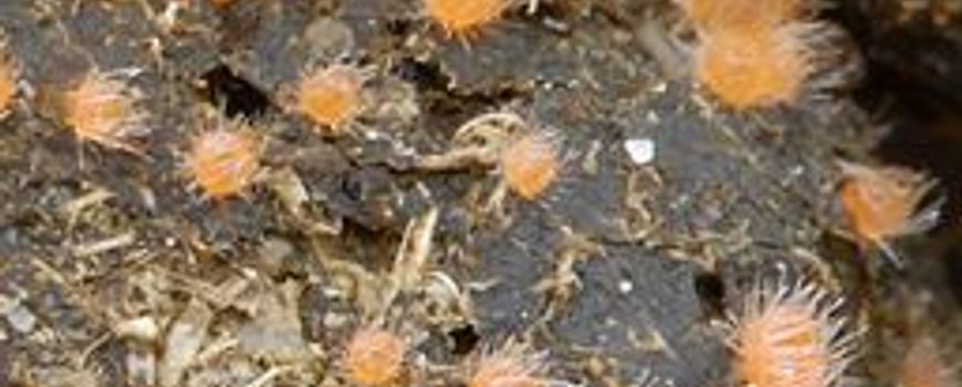 Op een droge, koude en winderige dag in maart, als de paddenstoelen maar niet willen komen, is er soms wel iets leuks te vinden op keutels. Maar je moet er wel voor bukken. En dan blijkt het ook nog een nieuwe soort te zijn: een borstelbekertje (Lasiobolus macrotrichus). Het lijkt zich weinig aan te trekken van temperatuur en droogte. De keutels lagen in een bos in Oostvoorne op een hoopje vochtige bladeren van loofbomen. Het is verrassend om een keuteltje vol kleine geeloranje gekleurde sterretjes, met het blote oog al zichtbaar, te vinden. Een loepje op zak is wel een must, om de details en de bijzondere schoonheid van dit kleinood te bekijken.