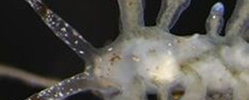Op de bovenstaande foto's is te zien hoe de Noordelijke knuppelslak er als volwassen dier uit ziet. Ook de eisnoeren en embryo's in de eisnoeren zijn afgebeeld. De glimmende uiteinden van de embryo's zijn minuscuul kleine schelpjes. Uit de eitjes komt een zogenaamde veligerlarve. Dit is een vaak vrijzwemmend microscopisch klein diertje: de afmeting van een veligerlarve is soortafhankelijk. Vaak is de larve kleiner dan 0,1 millimeter, maar het kan ook tot ongeveer 0,3 millimeter groot worden. Veel soorten veligerlarven proberen op deze wijze gedurende soms vele maanden in het plankton te overleven. Tot de omstandigheden goed genoeg zijn om zich verder te ontwikkelen tot volwassen dieren. Veranderende watertemperatuur en de signaalstoffen uit hun specifieke voedselbronnen zijn de signalen voor de larven om de metamorfose naar volwassen dier te beginnen. De veligerlarven nestelen zich dan op de bodem, kruipen uit hun kleine schelpje en gaan vervolgens over op het naakte bestaan waar deze diergroep zijn naam aan heeft ontleent. Op de onderstaande microscopiefoto en de video is een levende veligerlarve te zien die recent in het Grevelingenmeer is verzameld in een planktonmonster. Om welke soort het gaat kunnen we, op basis van deze beelden, helaas niet zeggen. Mogelijk is het een zomersoort die nu dus de winter probeert te overleven als veligerlarve. De wintersoorten, die het beste gedijen in het koude zeewater van dit seizoen, overleven de warme zomers als veligerlarve.