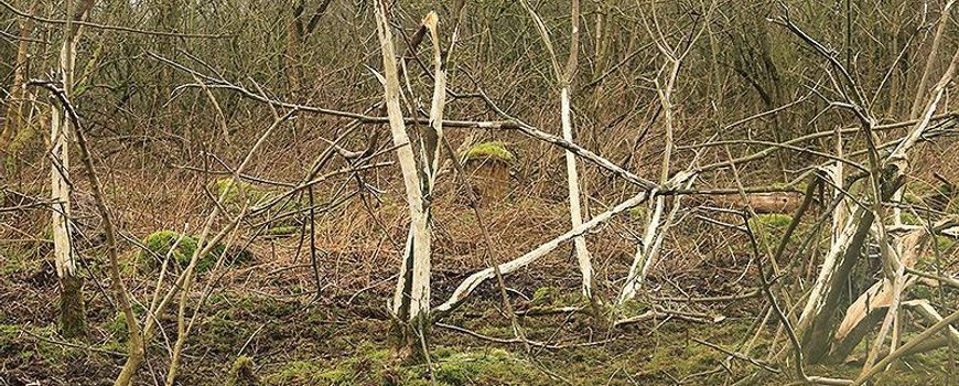 Het lijkt wel een ravage in het bos. Nu het voedselaanbod in de winter sterk is afgenomen, gaan de grote grazers op zoek naar alternatieven. Schotse Hooglanders eten nu de bast van onder andere kardinaalsmuts en linde. Door hun onderkaak in de struik of boom te zetten kunnen ze lange slierten bast lostrekken. Deze zit nog vol mineralen.
