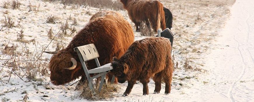 De winter is eindelijk aangebroken. Regelmatig valt er een klein laagje sneeuw, al is deze ook snel weer weg. Grote grazers als rund en paard deert het niet, de sneeuw blijft netjes op hun dikke wintervacht liggen. Een teken van goede isolatie.