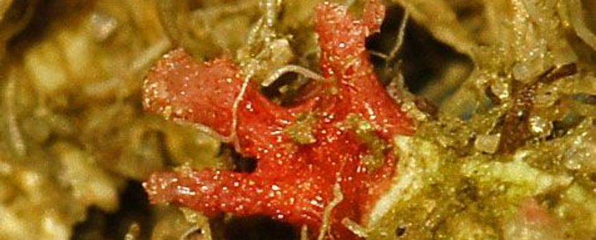 Het lijkt op een rood koraalachtig waaiertje. Maar dit sierlijke verschijnsel is een foraminifeer, een eencellig organisme met een kalkskelet. Het heet Miniacina miniacea. Fotograaf en Ecomare-medewerkster Sytske Dijksen vond het op de Hors op Texel, in de buurt van paal 7. Het is de eerste keer dat Miniacina miniacea in Nederland is gevonden. Sytske is vaak op het strand te vinden, weer of geen weer. Er valt van alles te ontdekken. Dit keer zat de vondst op een blauwe emmer behorende bij een kreeftenmand.
