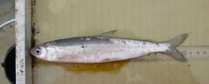 Wageningen Marine ResearchDe kleine marene (Coregonus albula) van 21 centimeter werd gevangen tijdens de vismonitoring met een boomkor op de IJssel. Deze vissoort is familie van de zalm. Hij kan maximaal ongeveer 45 centimeter lang worden.