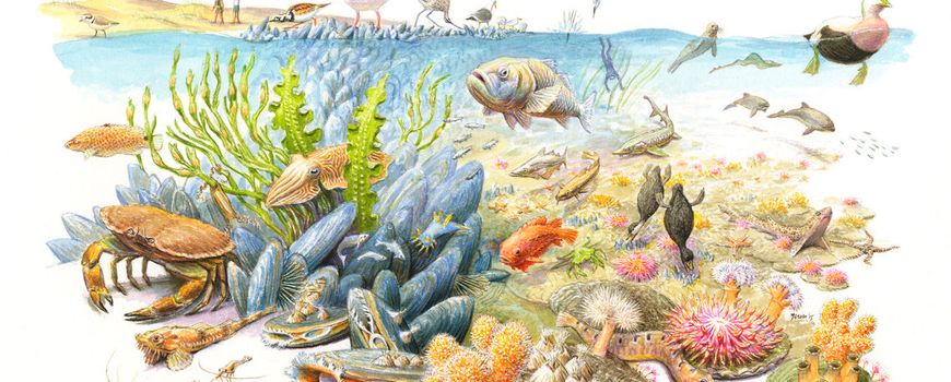 Tekening: Jeroen Helmer, ARK Natuurontwikkeling (leadfoto: schelpdierenbank)
