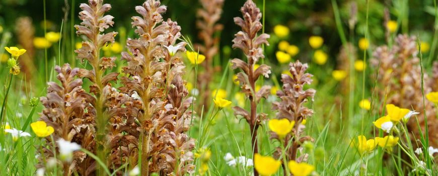ARK Rewilding Nederland“Een onaanzienlijk stronkje bleekselderij lijkt het, dat iedere groenteman met een greintje beroepseer tussen duim en wijsvinger zou pakken om het in de kliko te deponeren.” Zo omschreef een journalist van de Gelderlander enkele jaren geleden de rode bremrapen in de Millingerwaard. Er zit wel wat in, want bremrapen zijn planten zonder bladgroen en kunnen wat kwijnend overkomen. Maar het tegendeel is waar. Het zijn planten die parasiteren op andere planten en daar dus hun voedingsstoffen uithalen. De rode bremraap doet dat op sikkelklaver.