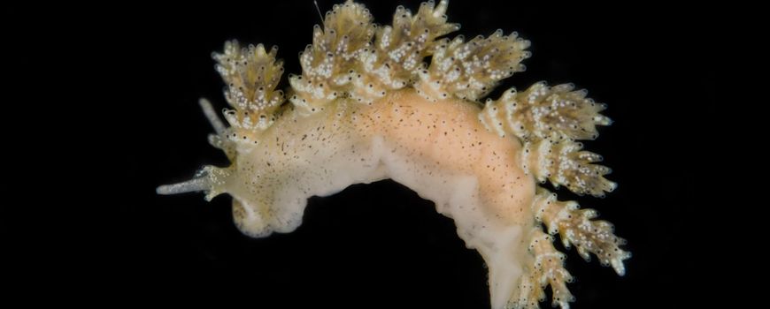 Stichting ANEMOONDe Zeespriet-kroonslak (Doto pinnatifida) is nu de 7e in Nederland voorkomende soort uit de familie van de kroonslakken. Deze familie kenmerkt zich door rhinoforen (reuksprieten) die in een kroonvormige schede op de kop staan. De cerata (uitstulpingen op de rug) staan in twee rijen gepaard aan weerszijden van de rug. Kroonslakken voeden zich met hydroidpoliepen. De Zeespriet-kroonslak voedt zich exclusief met Zeespriet (Nemertesia antennina) en dankt hieraan haar Nederlandse naam. Zeespriet komt voor op harde ondergronden in gebieden die onderworpen zijn aan een matige tot sterke stroming. Zeespriet wordt in het Nederlandse kustgebied, de Oosterschelde en Grevelingen niet aangetroffen. Op het Noordzeestrand (ook dat van Zeeland) spoelt de soort zo nu en dan aan.