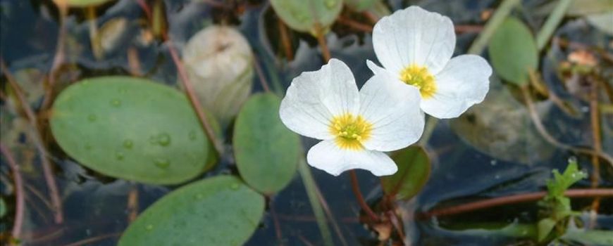FLORONDrijvende waterweegbree (Lurinium natans) komt voor in beken, vennen, kanalen en poelen met helder, voedselarm tot matig voedselrijk en zwak zuur water. Kenmerkend voor deze soort zijn de 2 centimeter grote bloemen met witte kroonbladeren die naar binnen toe geel kleuren. De bloemen worden doorgaans vergezeld door ronde tot ovale drijfbladeren van enkele centimeters groot. Onder water groeien meestal lintvormige bladeren die meerdere decimeters lang kunnen worden. Drijvende waterweegbree is het best in haar bloeitijd te herkennen, dat is van mei tot begin september.