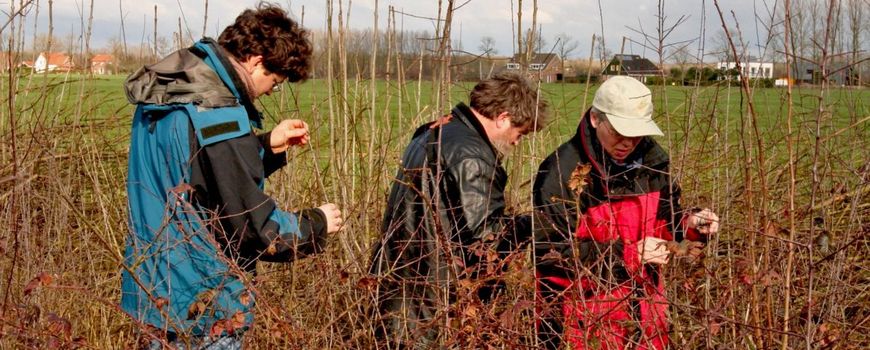 Ze zijn op zoek naar de sleedoornpage, een vrij zeldzame dagvlinder. Die is nu niet meer aanwezig, maar de eitjes zijn nu wel te vinden en die geven aan dat deze vlinder zich daar voortplant. Bij de sleedoornpage is dat een goede manier om de verspreiding in beeld te brengen. De vlinder zelf, die in augustus en september vliegt, leeft heel verborgen en het is moeilijk om deze te zien te krijgen. De mannetjes zijn alleen in de toppen van bomen en struiken aanwezig en de vrouwtjes komen maar af en toe naar beneden om nectar te drinken. De eitjes worden in de nazomer afgezet, maar ze blijven de hele winter aanwezig en in de bladloze kale struiken zijn ze het makkelijkst te vinden. De kleine eitjes zijn wit met schubjes en steken goed af tegen het donkere sleedoornhout. Ze zitten vooral in de oksels van zijtakjes op jonge, vitale struikjes.