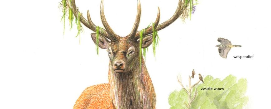 In de natuur is het edelhert heel belangrijk. Met hun geschil, gesnoei en gegraas zorgen edelherten voor een halfopen, gevarieerd landschap waar veel planten en dieren zich thuis voelen. Deze zogenaamde sleutelrol heeft tekenaar Jeroen Helmer uitgewerkt in een schitterende plaat.