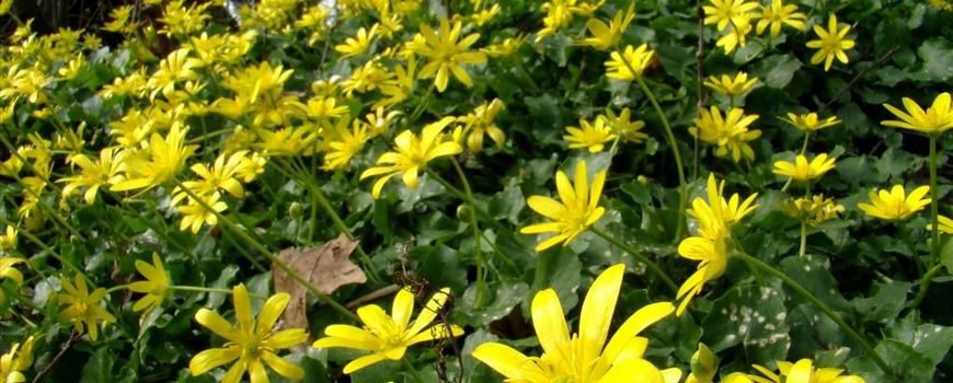 In vochtige en voedselrijke bermen en graslanden en langs oevers laten Gewoon speenkruid en Groot hoefblad zich zien. Speenkruid is onmiskenbaar door haar stervormige boterbloemgele bloemen en is een vrolijke noot in het verder nog grauwe landschap. Groot hoefblad is één van de weinige plantensoorten die eerst bloeit en dan pas blad vormt, een zogenaamde naaktbloeier. Deze tweehuizige plant vormt massavegetaties waarin meestal óf alleen mannelijke óf alleen vrouwelijke planten aanwezig zijn. De paarsroze tot bleekgele bloemen groeien in dichte trossen. De grote ronde bladeren verschijnen pas aan het eind van de bloeitijd eind april.