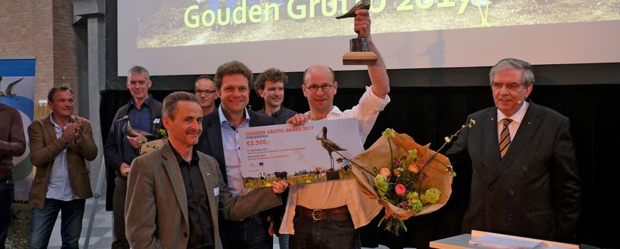 Vogelbescherming NederlandDe Gouden Grutto bestaat uit een publieksprijs en een vakjuryprijs, van 2.500 en 5.000 Euro. Marcel Strijtveen won de publieksprijs. De vakjuryprijs, uitgereikt door oud-landbouwminister en boer Cees Veerman, werd tijdens de conferentie ‘Succesvol boeren met de natuur: ontmoet de praktijk’ uitgereikt aan Marten Dijkstra uit Aldeboarn. ‘De jury maakt een diepe buiging voor deze voortrekkers.’ Op de foto bovenaan de pagina ziet u Marcel Strijtveen met zijn prijs.