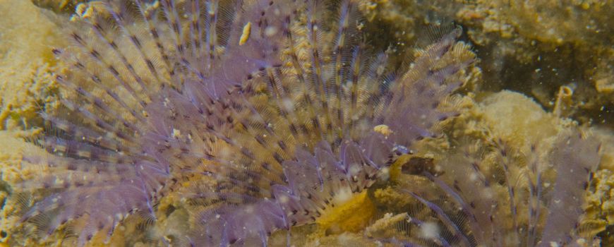 Stichting ANEMOONDe Paarse kokerworm (Bispira polyomma) leeft in een met fijn slib zelfgebouwde koker van slechts een paar centimeter lengte. Op de kop zit een krans van geveerde tentakels die hij gebruikt voor het filteren van zeewater, zo vangt hij zijn voedsel. De krans heeft een doorsnede van ongeveer vier centimeter en heeft een typisch gevlekt, bruinzwart en paars patroon.