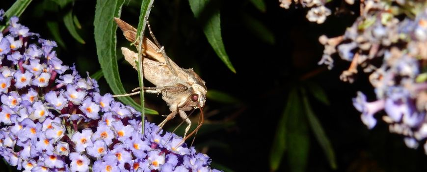 Nu de vlinderstruik (Buddleja) bloeit, zijn er ook ’s avonds vlinders te zien in je tuin. Ga maar eens, vanaf ongeveer een half uur na zonsondergang de tuin in met een zaklamp. Als je op een zachte avond met een zaklamp de vlinderstruik beschijnt zie je vast en zeker mooie rode lichtjes. De lichtjes zijn de weerkaatsing van het lamplicht in de ogen van nachtvlinders. Er zijn heel wat soorten die je op bloemen kunt vinden, maar de meest algemene zijn gamma-uil, die ook overdag te zien is en huismoeder. Die laatste is nu al veel aanwezig. De eersten vliegen al in juni, in augustus is de piek, maar ook in september zijn ze er nog volop. Huismoeders zijn vrij grote nachtvlinders met een opvallend ‘langwerpig’ uiterlijk. Wel zijn ze buitengewoon variabel van kleur. Zo zijn er vrijwel helemaal effen lichtbruine exemplaren, maar ook erg bont en donker getekende huismoeders. Het is een erg wijd verbreide soort, die zich in allerlei leefgebieden thuis voelt. De rups, die van september tot in mei aanwezig is, leeft op allerlei kruidachtige planten en grassen.