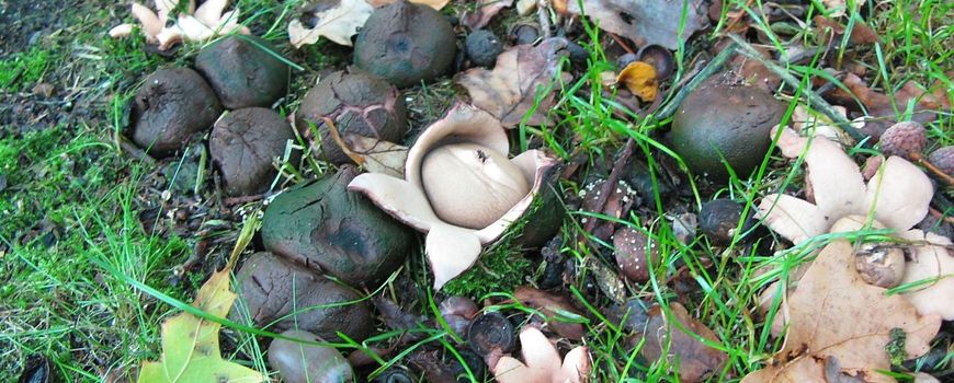 Nederlandse Mycologische VerenigingDe op tulpenbollen lijkende knollen lagen al enige tijd op het grasveld van een drukbezochte plaats in een Arnhems park. Bijna niemand wist wat het precies waren en hoe ze daar terecht waren gekomen. Zat er nog leven in de knollen of waren ze aan het rotten? Iedereen vond het tijd dat de gemeente die troep eens zou gaan opruimen. Het bleek echter te gaan om de Gekraagde aardster (Geastrum triplex). Deze aardster is zonder twijfel de meest voorkomende aardstersoort van Nederland. Een beetje paddenstoelenkenner herkent deze aardster zelf wel, maar de donkere knollen waaruit ze ontspringen vaak niet. Ook tijdens excursies reageren deelnemers soms verbaasd als ik hen attendeer op de donkere knollen in de vorm van een ui of tulpenbol. Vanwege de lemige en harde bodem en het korte gras zaten de Arnhemse exemplaren niet gedeeltelijk verstopt in de humuslaag, maar lagen ze letterlijk op het maaiveld.