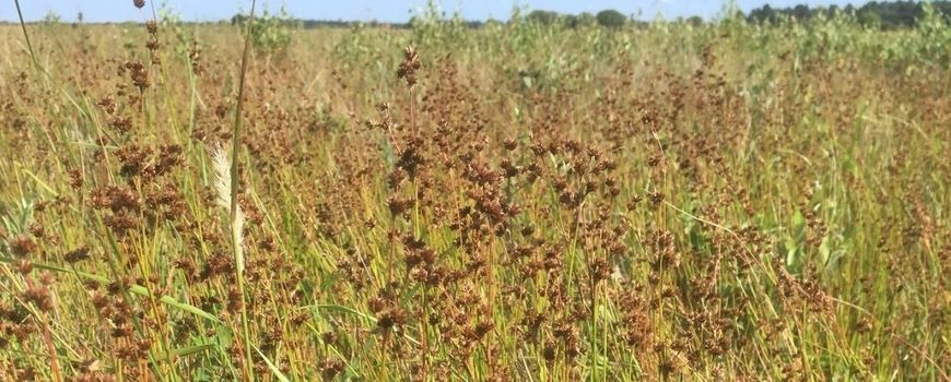 De Amerikaanse rus Juncus acuminatus, een nieuwkomer in Europa die zich al stevig gevestigd heeft