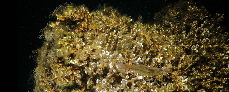 Foto's: Ron Offermans (leadfoto: een rif van de Trompetkalkkokerworm in het Noordzeekanaal, met vooraan een op het rif fouragerende steurgarnaal)